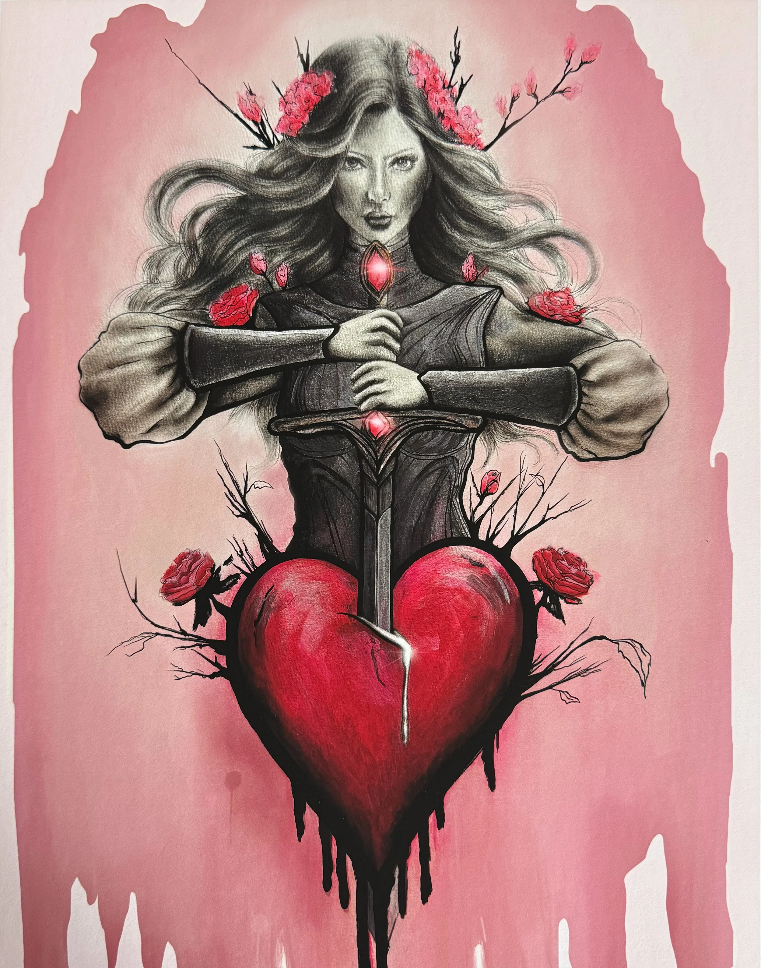 This piece lives in that space — between romanticism and defense, love and detachment, beauty and blunt force.